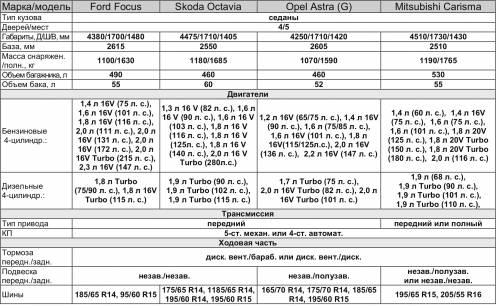 Участники нашего обзора – седаны Ford Focus, Mitsubishi Carisma и Opel Astra (G). В эту компанию мы включили и лифтбек Skoda Octavia, так как эта машина составляет основную конкуренцию вышеперечисленным моделям и внешне похожа на седан (у лифтбека крышка багажника открывается вместе с задним стеклом). Именно такая версия Octavia наиболее распространена в Беларуси.