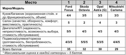 Лидером среди сегодняшних участников обзора стал Ford Focus – именно у этого автомобиля лучше всего сбалансированы потребительские качества, что и позволило ему набрать наибольшее количество баллов – 35. Второе место заняла Skoda Octavia – 30 баллов, а Opel Astra всего на один балл опередила Mitsubishi Carisma – 30 и 29 баллов соответственно.