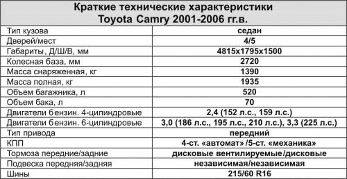 Toyota Camry 2001-2006 гг.в. — очень качественный автомобиль. Да, он уступает по многим позициям Audi A6, BMW 5-й серии или Mercedes E-класса, зато ощутимо дешевле немецких седанов премиум-класса. В сравнении с непосредственными конкурентами Camry смотрится более чем достойно, причем надежнее многих из них. Поэтому Toyota Camry можно смело рекомендовать к покупке.