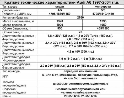Audi A6 1997 – 2004 гг.в. встречаются у нас как передне-, так и полноприводные. Бояться полного привода quattro не стоит - важно только соблюдать несколько основных правил эксплуатации таких автомобилей: не применять шины с разным рисунком протектора, следить за целостностью пыльников ШРУСов (в полноприводной версии их 8 штук) и регулярно, через 70 тыс. км пробега, менять масло в заднем редукторе.