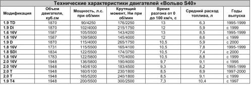 Автомобиль «Вольво S40» первого поколения оснащается тремя бензиновыми двигателями с прямым впрыском топлива объемом 1,6; 1,8 и 2,0 л и одним 1,9-литровым дизельным. Кроме того, в линейку моторов входят также спортивные турбоверсии: 2.0 Т и Т4. Все эти двигатели реагируют очень быстро и мощно на движение педали акселератора, что позволяет очень быстро набрать скорость при выходе из поворота или при обгоне грузовика. Это также означает меньшее количество переключений передач в городских условиях.