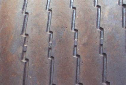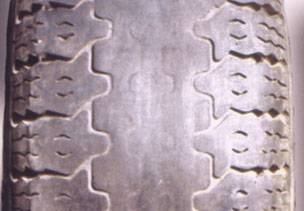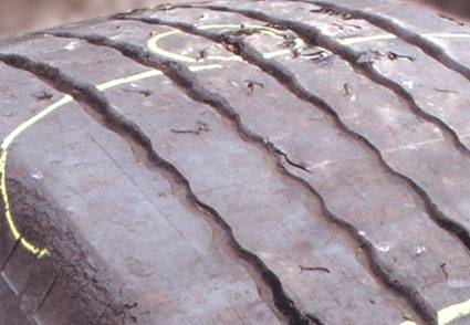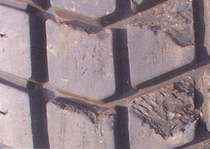 Ускоренный износ беговой дорожки, если он равномерный и симметричный (фото 1), чаще всего связан с движением на повышенной скорости по дорогам с некачественным покрытием. Износ становится еще более интенсивным, когда такая дорога изобилует большим количеством поворотов, подъемов и спусков или требует частых ускорений и притормаживаний. Кстати, аналогичный износ наблюдается при активном стиле вождения - с резкими разгонами и частыми торможениями. У грузовых автомобилей со сдвоенными шинами причина может заключаться в различном давлении воздуха в соседних колесах.