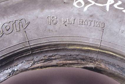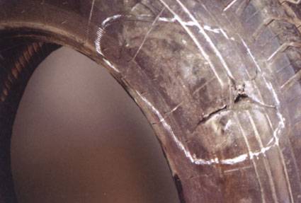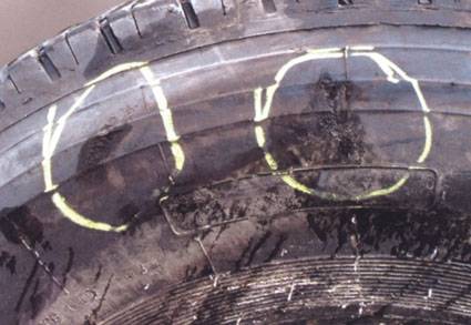Достаточно часто фиксировались случаи механического повреждения беговой дорожки (фото 5) или боковины покрышек (фото 6). Причины - наезд на острый предмет, неосторожное приближение транспортного средства к бордюру тротуара. Сдвоенные шины грузовиков требуют постоянного контроля пространства между их боковинами. Результат действия застрявшего между боковинами и не удаленного своевременно постороннего предмета - см. фото 7. Повреждение пятки борта покрышки (фото 8) чаще всего бывает связано с неквалифицированным монтажом шины на колесный диск, наличием повреждения на закраине обода либо несоответствием между посадочными размерами покрышки и диска.