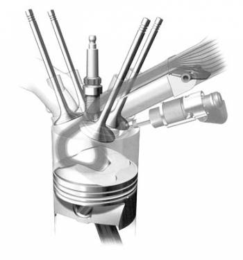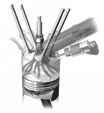 Впрочем, сначала о рабочем процессе. Главную роль в нем играет движение воздуха в цилиндре двигателя. В двигателе GDI воздушный поток сначала разгоняется в длинном вертикальном канале впускного тракта, затем падает вниз на днище поршня, имеющее сложный профиль, и, отражаясь от него, сильно завихряется. Этот вихрь сохраняется до конца такта сжатия, когда форсунка подает внутрь цилиндра топливо. Поршень опять-таки с помощью своего профилированного днища придает топливной струе направление в зону электродов свечи зажигания, а вихрь быстро перемешивает пары бензина и воздуха и, что особенно важно, удерживает облачко бензовоздушной смеси возле свечи зажигания.