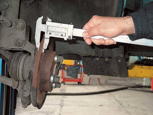 Определить состояние тормозного диска без использования измерительного инструмента достаточно сложно. Так, разница в толщине нового и предельно изношенного диска обычно составляет 1–3 мм, а максимально допустимое биение – и вовсе сотые доли миллиметра (для Lanos – 0,03 мм). Толщину диска обычно измеряют штангенциркулем, причем замер делается в рабочей зоне, а не по наружному буртику.
