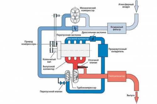 При параллельном наддуве, вместо одной большой, используют две одинаковые маленькие турбины, которые работают независимо друг от друга. Чем меньше турбина, тем быстрее она раскручивается, тем более «отзывчивым» получается двигатель. Две турбины ставят на V-образные двигатели, по одной на каждую «половинку».