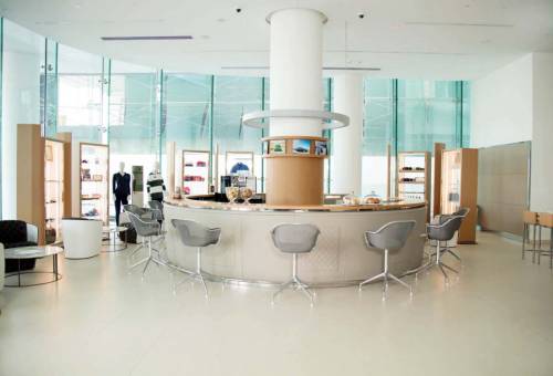В отделке салона использованы те материалы, что и в салонах этих роскошных автомобилей – полированный металл, дерево, дорогая кожа. В дилерском центре оборудована специальная комната для выполнения индивидуальных заказов автомобилей, сад с террасой на крыше, водяная завеса на входе. При въезде на парковку установлена система, считывающая номерные знаки. Постоянных владельцев дилерского центра на Bentley она пропускает по умолчанию.