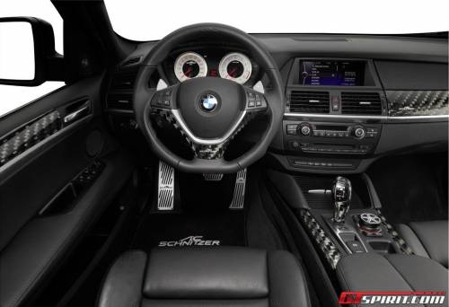 Салон BMW X6 M в AC Schnitzer украшают модернизированный щиток приборов со спидометром, который размечен до 360 км/час, новое рулевое колесо, карбоновые вставки, алюминиевые педали и велюровые коврики на полу.