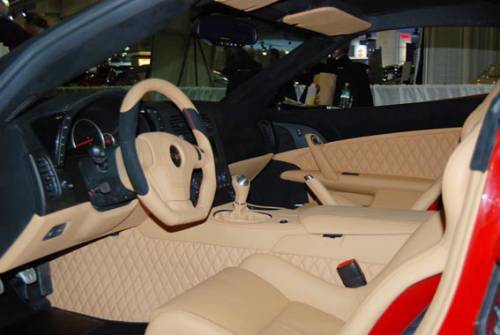 В салоне, отделанном кожей с красной строчкой, специалисты по тюнингу установили новые "ковши", иной руль, карбоновые и алюминиевые накладки, подчеркивающие спортивный нрав автомобиля.