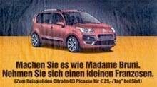 Одна из последних рекламных акций Sixt содержит принт, на котором изображен компактный автомобиль Citroen, а под ним огромный слоган: "Сделайте как мадам Бруни – возьмите маленького француза!".