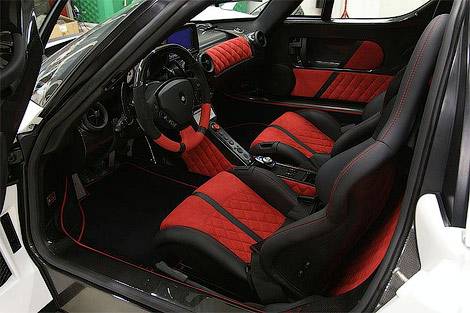 В салоне тюнингового суперкара появились вставки из красной алькантары, аудиосистема с большим жидкокристаллическим экраном, расположенным в верхней части центральной консоли, и фирменные коврики с красной прострочкой.