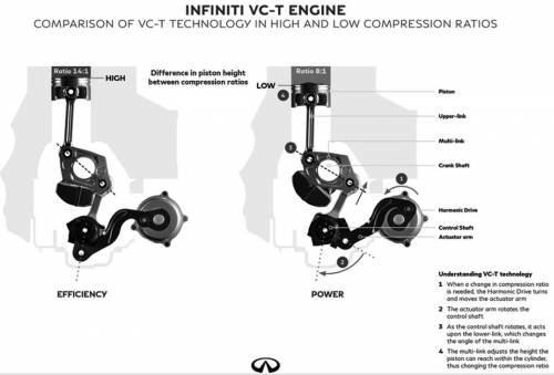 Такая схема позволяет изменять степень сжатия от 14:1 при умеренной нагрузке и малых оборотах до 8:1 при интенсивных ускорениях и максимальном давлении наддува. Как сообщили в Infiniti, мотор с системой VC-Turbo работает плавнее, чем традиционные линейные двигатели, а уровень шума и вибраций значительно ниже, чем у двигателей V6.