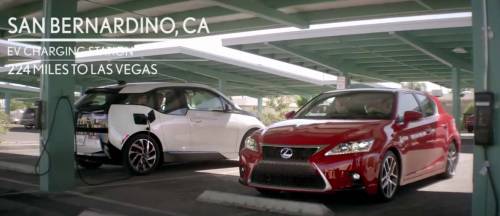 В то время как компания на CT200h добирается до Вегаса без остановок и начинает вовсю развлекаться, бедолаги на BMW i3 вынуждены несколько раз остановиться для зарядки своего электромобиля.