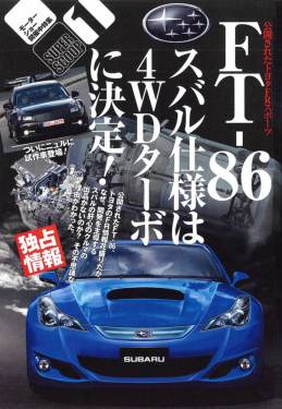 На международном автосалоне в Токио японский автогигант Toyota продемонстрировал заднеприводное концептуальное купе FT-86, созданное вместе с инженерами Subaru. Чуть позже свой вариант автомобиля покажет и компания Subaru, а пока японские журналисты с помощью дизайнеров разработали предполагаемое изображение купе Subaru, основанное на скетчах и слухах.