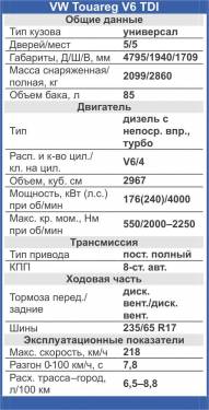 Если собрать все ощущения от новинки воедино, то однозначно можно сказать, что Volkswagen Touareg стал совершенно иным. Он менее грузный и тяжеловесный, более легкий в управлении и хорошо реагирует на руль. А благодаря опционной пневмоподвеске с изменяемой жесткостью амортизаторов (Normal, Comfort и Sport) можно менять и плавность хода. Его моторы не только хорошо сбалансированы, но и весьма экономичны (в особенности базовый 3.0 V6 TDI). Запас опций – огромен, привод – на выбор. Одним словом, искусно поработав, в Вольфсбурге сотворили автомобиль, который в ближайшие годы будет выглядеть достойно даже рядом с произведениями большой немецкой тройки – BMW, Mercedes и Audi.