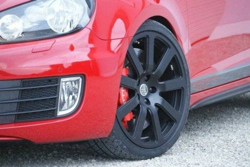 Тюнеры ателье MTM Volkswagen Golf GTI шестого поколения поставили на легкосплавные черные диски размерностью 19 дюймов с резиной Continental XL Sportcont и установили на модель мощную тормозную систему компании Brembo.
