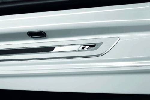 В салоне установлено трехцспицевое многофункциональное рулевое колесо, обернутое в кожу, алюминиевые вставки, логотипы R-Line и парктроник.