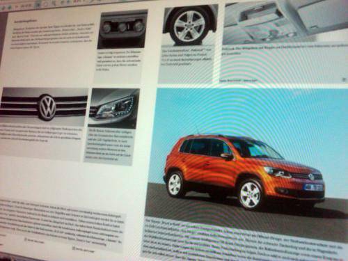 На изображении, отсканированном, скорее всего, с официальной брошюры, запечатлена задняя часть немецкого кроссовера Volkswagen Tiguan. От нынешней версии автомобиля рестайлинговая модификация модели в задней части отличается только новыми светодиодными фарами, а спереди у Tiguan появились модифицированный передний бампер с новыми противотуманками, фирменная радиаторная решетка с хромированными планками, иная головная оптика со светодиодными секциями. На более ранних снимках также видно, что в салоне немецкого "паркетника" установили новый блок управления климат-контролем.