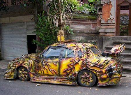 А вот у владельца этого несчастного автомобиля на уме было кое-что другое. Непонятно, чего он ожидал получить в итоге, но, судя по всему, чудак остался не очень доволен результатом. Автомобиль был безобразно окрашен до такой степени толстым слоем краски, что он стал неузнаваем и даже ужасен.