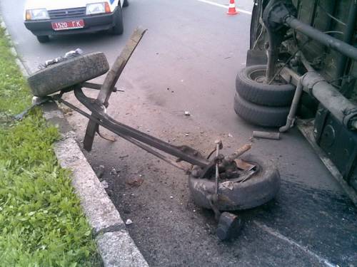 Судя по всему, скорость микроавтобуса была не большой. Но и этого было достаточно, чтобы у автомобиля вырвало переднюю балку с амортизаторами. Во время ДТП в маршрутке находились люди. Со слов инспекторов ГАИ, серьезных пострадавших нет. Люди эвакуировались через задние двери.