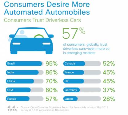 Исследование, охватившее 1 500 автолюбителей, проживающих на территории десяти стран мира, продемонстрировало, что большинство потребителей готовы доверить управление машиной электронике. В Бразилии перевести автомобиль с ручного управления на автопилот согласны 95% опрошенных, а 92% респондентов заявили, что позволят своим детям передвигаться на машинах-роботах.