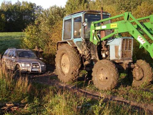 Обычно это помогает выехать. Можете также уменьшить давление в шинах – до 1 атмосферы. Если сдуете колеса больше – покрышка может оторваться от диска. И тогда останется только идти в близлежащую деревню за трактором. Если машина не желает выезжать и уже села на землю своим днищем, то ситуация немного ухудшилась, и значит, придется попотеть. Вынимайте домкраты, топор, саперную лопатку - и за дело. Нарубите дров. Палки должны быть толщиной от 5 до 10 см . Длину подберите сами. Иногда приходится выстраивать целую дорожку до того места, где можно ехать без опаски застрять - асфальта или щебенки. Подкладывайте под домкраты подставки. И поочередно поднимайте колеса машины. Подняв колесо, положите в ямку траву или же ветки, чтобы закрыть углубление, а на них уже кладите «дрова». После чего опускайте колесо. И так четыре раза. После этого машина стоит на деревянной «дороге», а не сидит на днище. Можно начинать ехать. Но будьте аккуратные - чаще всего, начиная движение на «деревянной дороге», водители сразу сажают машину после нее. Поэтому имеет смысл построить дорогу до выезда на нормальное покрытие - времени уйдет больше, но если не построить, то поднимать машину с «брюха» придется раз 5-6. Построив дорогу - спокойно и плавно выезжайте.