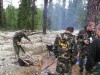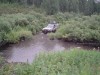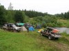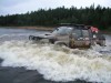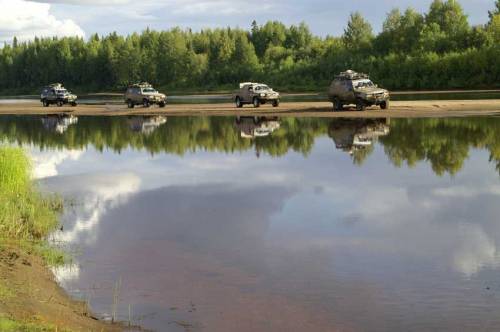 После разведки успешно преодолеваем водную преграду, ставим лагерь на правом берегу Кымы, празднуем победу, гордясь собой и своими машинами. Внизу по реке видна деревня Усть-Кыма. Наутро купаемся в холодной воде и залечиваем “раны”. Для каждого экипажа находится работа: в мостах – водно-масляная эмульсия; почти нет тормозов на всех машинах (тормозные колодки стерты до металла); радиаторы забиты грязью, не работает один стартер и два генератора. Но это все мелочи. Главное, Печорский тракт покорен. Преодоление тех самых «непроходимых» 270 километров заброшенного тракта заняло 16 дней, хотя еще век назад обычная почта из Усты-Кымы доходила до Усть-Цильмы всего за 6 дней. По приборам GPS пройдено расстояние 306 километров, это с учетом объездов. Честно говоря, мы не надеялись на столь стремительное прохождение маршрута и запасы продовольствия рассчитывали на три месяца.