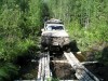 Но мы не вернулись. И машины не утопили, хотя попытки были. Дорога встречает нас мокрыми глинистыми подъемами, почти на все приходится затаскивать машины на лебедках. Затем подъемы сменились болотами. Дорожное полотно опустилось ниже уровня грунта и превратилось в болото. Иногда перед нами открывалось изумительнейшее по красоте болото. Дорога столетней давности почти не просматривалась. Болота – самые труднопреодолимые препятствия. Сначала их проходили вброд, нащупывая старые полуразрушенные гати, часто на глубине около метра. Поломанные бревна местами встали торчком, и вдоль них тянется глубокий тракторный след. Если не было гатей – сами настилали бревна. А затем по одному очень осторожно переправляли тяжелые автомобили. Иногда машина соскальзывала с гати в болото, и тогда тратили часы на то, чтобы поставить с помощью лебедок и траков внедорожник обратно. Чахлая болотная растительность в этих случаях служила очень ненадежным якорем для лебедок. В заболоченном лесу передвигаться легче, однако часто приходится удерживать деревья руками. Нетрудно представить, насколько опасны такие переправы как для водителей, находящихся в автомобилях, так и для штурманов, идущих по болоту вброд. В самых труднопроходимых местах за сутки продвигались всего на 3-4 км.