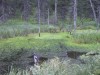 К середине маршрута болота встречаются все реже, мы поднимаемся на Тиманский кряж – водораздел бассейнов Печоры и Мезени. Высота около 200 метров. Здесь болота отличаются от тех, что встречались в первые дни. Их глубина, как правило, меньше, дно твердое, каменистое, да и размеры скромнее. Это водораздельные верховые болота, которые питают многочисленные реки, стекающие по обе стороны Тимана. Пробираемся по мари – это тонкий слой дерна, метровый слой жижи, ниже камень. Здесь главное – угадать правильное направление и не угодить в камень. Ручьи здесь текут в глубоких оврагах, поэтому приходится иногда устраивать березовые гати. Это настоящие “триалы” из бревен.