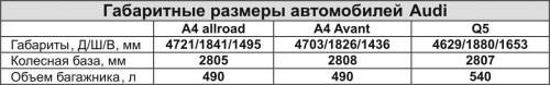 Наибольшей габаритной длиной может похвастаться Audi A4 Аllroad: он на 18 мм длиннее своего «донора». Длина Q5 – 4629 мм, что вполне достаточно для внедорожника малого класса. Зато благодаря большой колесной базе и наибольшей габаритной высоте Audi Q5 обладает самым большим багажником – 540 л против 490 л у А4. По пропорциям кузова A4 Аllroad находится ровно посередине между А4 и Q5. Ведь A4 Avant Quattro – не что иное, как обычный универсал, пусть и с полным приводом. В то время как модификация Аllroad – почти внедорожник с должными элементами защиты кузова и моторного отсека. А Q5 – это уже современный «премиум-паркетник». Конечно, до Q7 ему еще далеко, но с функцией «погонять по пляжу» или «проехать по сугробу» автомобиль справится на отлично.