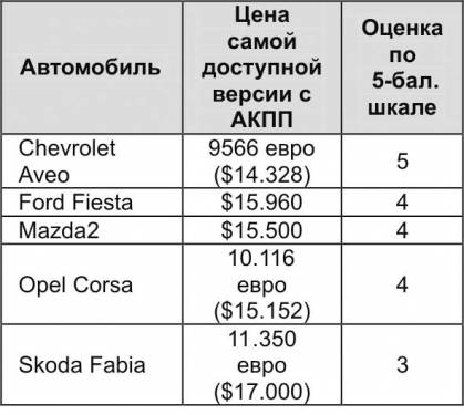 Для автомобилей B-класса очень важна минимальная стоимость версии с «автоматом», ведь именно этот тип трансмиссии обычно предпочитает лучшая половина человечества. Дороже всего обойдется Skoda Fabia с АКПП – это будет автомобиль с бензиновым 1,6-литровым мотором мощностью 105 л.с. в базовой комплектации. Mazda2 с автоматической трансмиссией имеет те же двигатель и комплектацию, что и базовый автомобиль, Corsa и Fiesta оснащаются более мощными моторами – 1,2 л (80 л.с.) и 1,4 л (96 л.с.) соответственно. А базовый Chevrolet Aveo оснащается двигателем 1,4 л (94 л.с.) и имеет дополнительно кондиционер и подушку безопасности пассажира.