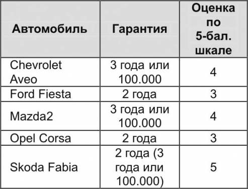 Покупатель Skoda Fabia может выбирать срок гарантии – либо 2 года без ограничения пробега, либо 3 года или 100.000 км пробега, поэтому автомобиль получает высший балл. Chevrolet и Mazda, имеющие по 3 года или 100.000 км гарантии, получают по четыре балла, а Ford и Opel, предлагающие гарантию 2 года – по 3 балла.