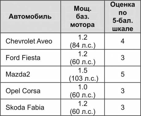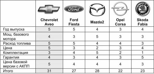 В рамках сегодняшнего обзора по сумме набранных баллов первое место занял Chevrolet Aveo, который представляет собой лучшее соотношение по критерию цена/комплектация. Лишь немного отстали от него соплатформенные Ford Fiesta и Mazda2, ну а догоняют их Skoda Fabia и Opel Corsa, которые набрали меньший балл главным образом из-за небогатой базовой комплектации.