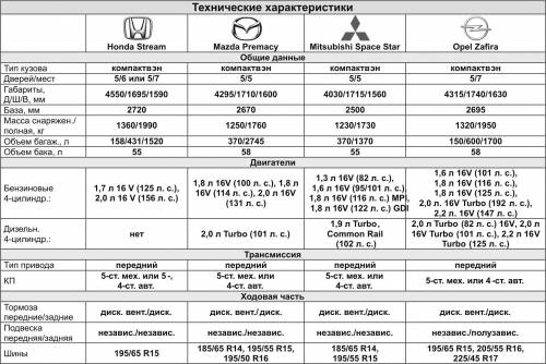 В сегодняшнем обзоре – четыре компактвэна: Honda Stream, Mazda Premacy, Mitsubishi Space Star и Opel Zafira. Наиболее распространенные – Space Star и Zafira, чуть менее – Premacy, а вот Stream встречается реже.