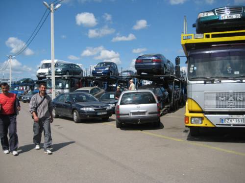 Типичная картина для каунасского авторынка – бесконечная вереница автовозов и перегонщики из разных стран