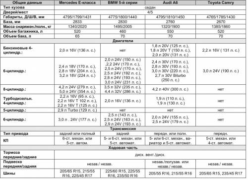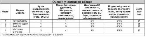 Взвесив потребительские качества всех участников обзора (см. таблицу), пальму первенства мы отдали Toyota Camry. Именно этот автомобиль отличается самой высокой надежностью, наилучшей практичностью и, что немаловажно, наиболее приемлемой стоимостью. Второе место досталось BMW 5-й серии, ну а третье разделили между собой Audi A6 и Mercedes E-класса.