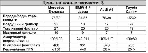 Самой недолговечной на наших дорогах оказалась подвеска «глазастого», к тому же стоимость ее обслуживания удорожает то, что верхние шаровые опоры меняются вместе с рычагами. Совместно с «резинками» поставляются и рычаги задней многорычажной подвески, которые изнашиваются практически равномерно. Чуть дольше, чем у E-класса, служит передняя подвеска Audi A6. Ее алюминиевые рычаги поставляются вкупе с сайлент-блоками и шаровыми опорами. Заметно дольше выхаживает подвеска «пятерки», у которой в оригинале большинство сайлент-блоков задней подвески поставляются вместе с рычагами. Хотя можно сэкономить, установив неоригинальные «резинки», – они предлагаются отдельно, но служат меньше. Нет замечаний и к долговечности подвески Camry, которая также дорога в обслуживании.