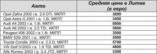 Не стоит забывать о том, что цены, приведенные в таблице, – очень условные, но их вполне достаточно для того, чтобы иметь общее представление о ценах на различные авто в Литве. Очень многое зависит от комплектации, количества дверей, пробега, страны, из которой привезена машина, и т. д. Плюс к этому помните о том, что очень многие машины (если не все), которые приходят к нам с литовского рынка, имеют мелкие (а иногда и не совсем мелкие) кузовные недостатки, которые потом убираются местными умельцами.