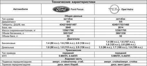 Ford Focus на 93 мм длиннее и на 87 мм шире, чем Opel Astra, что положительно сказалось на объеме багажного отделения и удобстве задних пассажиров. Трое на «галерке» Ford Focus будут чувствовать себя более комфортно, нежели в Astra, однако этого недостаточно, чтобы три взрослых человека чувствовали себя комфортно, как в представительском автомобиле.