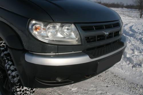 Издалека UAZ Patriot смотрится как импортный внедорожник: солидный профиль кузова, аккуратный пологий капот, огромный дорожный просвет, мощные колеса, функциональный пластиковый обвес крыльев, удобные подножки, большие линзованные фары, изящная решетка радиатора.
