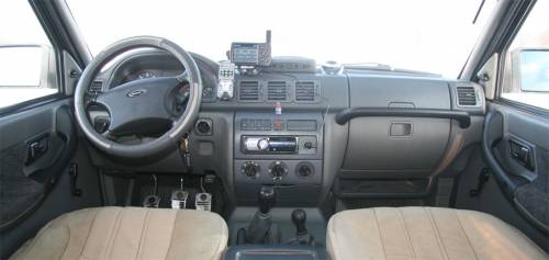 Торпедо – это уже не просто железка с приборами от грузовика, а нормальная панель с привычно расположенными органами управления, информативным щитком приборов, дефлекторами воздуховодов, магнитолой, блоком управления светом и печкой. Есть даже подстаканник и пара вместительных «бардачков». Поручень перед пассажиром – обязательный атрибут внедорожника.