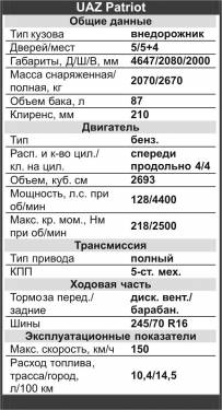 Одним словом, UAZ Patriot – внедорожник для настоящих мужчин, не обращающих внимания на «детские болезни» машины, сильных духом и телом (педали довольно тугие), не боящихся в случае необходимости открыть капот и засучить рукава, уверенных в себе и своем «железном коне».