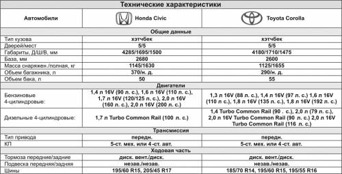 У нас обе модели распространены с бензиновыми моторами под капотом. Турбодизельные версии встречаются очень редко и не пользуются спросом у наших автомобилистов. Кстати, бензиновые агрегаты, предназначенные для 5-дверных хэтчбеков Civic и Corolla, одинаковы по объему и имеют схожую мощность: 1,6-литровые – 110 л.с. и 1,4 л – 90 и 97 л.с. При этом они обеспечивают автомобилям почти равную динамику.