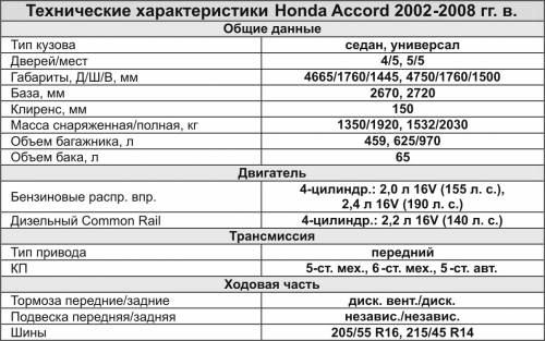 В Accord 2002-2008 гг. в. конструкторы вложили весь четвертьвековой опыт эксплуатации всех поколений модели в Старом Свете. От предшественника оставили все лучшее и приумножили то, что всегда было отличительной особенностью Honda в D-классе: динамичность, комфорт, стиль. Автомобиль популярен в Беларуси, хотя за удачное воплощение в одной машине достижений 25-летних исследований приходится платить – даже самые «взрослые» Accord дороже конкурентов-одноклассников.