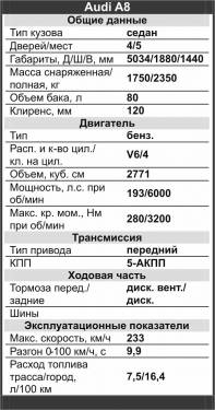 Приобрел этот автомобиль совсем недавно и, можно сказать, еще не вкусил всех прелестей данной модели. Первые впечатления: машина очень мягкая (несмотря на 18-дюймовые колесные диски), комфортная, салон просто огромный, багажник вместительный. А8 отлично держит дорогу и хорошо управляется. Считаю ее достойной альтернативой BMW 7-й серии. Насчет того, что A8 считается дорогой в обслуживании, ничего сказать не могу – пока не требует вложений.