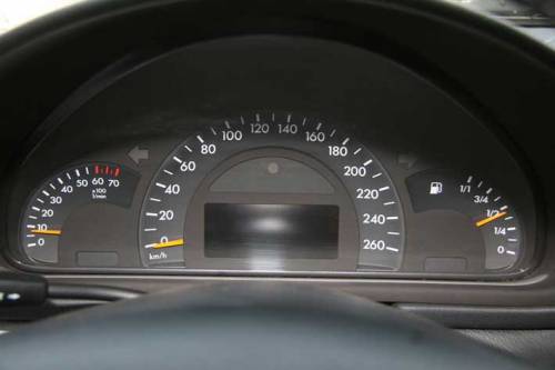 На щитке под овальным козырьком главные приборы – огромный спидометр и дисплей борткомпьютера, по бокам – секторы скромного тахометра и указателя запаса топлива, оцифрованного в дробях, и все! Просто, но достаточно информативно. Традиционно единственный подрулевой рычажок функциями не перегружен – управление светом возложено на вращающийся тумблер, расположенный на панели слева от руля, там же находятся джойстик регулировки зеркал и корректор фар. Замок зажигания для электронного ключа расположен на передней панели, как и у всех Mercedes.