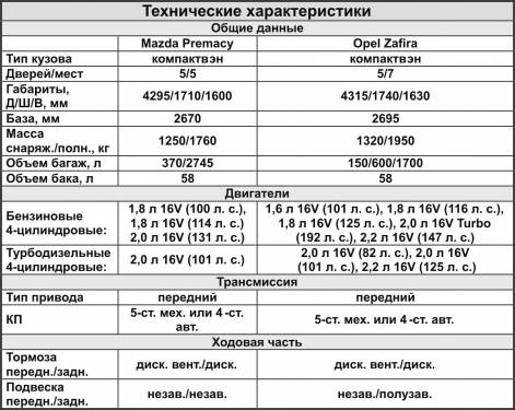 Mazda Premacy – для тех, кто ценит функциональность компактвэна: благодаря съемным задним сиденьям этот автомобиль превращается во вместительный грузовой фургон. Opel Zafira с его немалой пассажировместимостью подойдет большой семье или любителям путешествовать дружной компанией. Обе эти модели за счет соответствующей настройки шасси понравятся сторонникам активной езды. В плане надежности небольшое преимущество есть у Premacy, зато стоимость обслуживания Zafira более доступна.
