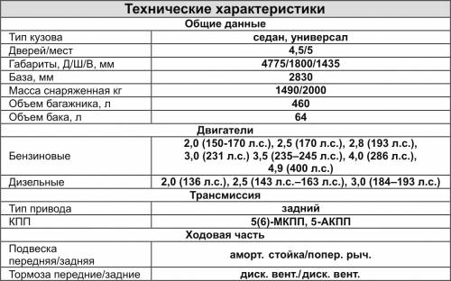 Достаточно серьезный конкурент нашему герою – «ешка» от Mercedes-Benz. Помимо роскошного салона, достойного автомобиля премиум-класса, Е-класс предлагает широкий выбор двигателей – от скромных четырехцилиндровых до мощных V8. Выпускается «очкарик» с 1995 года. На нашем рынке чаще всего встречаются модели, оснащенные 2,2- или 2,3-литровыми бензиновыми моторами. Реже можно встретить 3,2-литровую «шестерку». По мощности и динамике разгона «мерин» проигрывает «баварцу». Зато опережает его по количеству места на заднем диване.