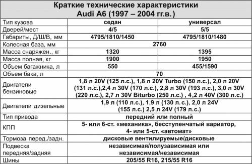 Выпускалась Audi А6 в двух модификациях – 5-дверный универсал Avant и 4-дверный седан, наиболее распространенный в Беларуси. Их кузова традиционно для Audi оцинкованы, а капот и крышка багажника изготовлены из алюминия, чтобы снизить вес. Отрицательная сторона такой особенности – сложность ремонта деталей, выполненных из «крылатого» металла. Как правило, они не рихтуются, поэтому приходится покупать новые.