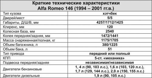 Какой из рядных моторов предпочтительнее – сказать сложно. Они все довольно надежны и при регулярном обслуживании работают верой и правдой по 300 тыс. км. Вот разве что 1,4-литровый двигатель (103 л.с.) считается все же слабоватым, хотя до 150 км/ч даже на наших дорогах на таком автомобиле разогнаться можно. Alfa Romeo 145/146 с 2-литровым агрегатом, конечно же, самые быстрые. Но зато и расход топлива у них приличный – в городе при резких стартах (а иначе не получается) на 100 км уходит около 15 л бензина.
